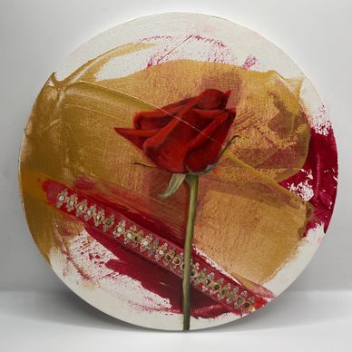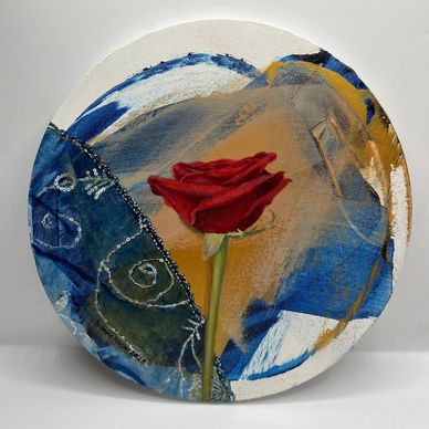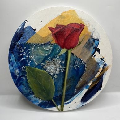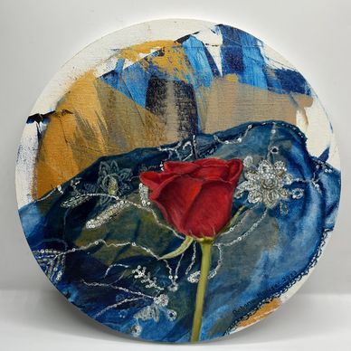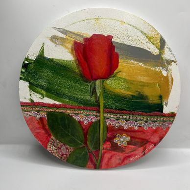 12" Round Canvas with edges of canvas painted. Hanging wire on the back of the canvas, ready to enjoy and display in your home. For all enquiries please email.